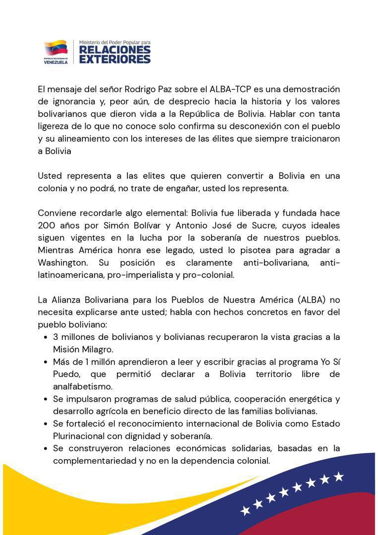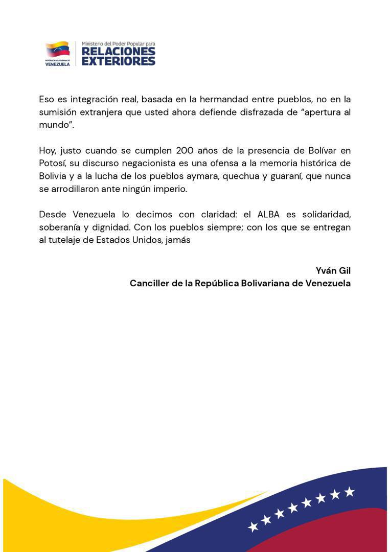 Canciller Yvan Gil respondió a Rodrigo Paz por sus comentarios sobre el ALBA-TCP, señalando que estos revelan una completa ignorancia y desprecio por los principios y la historia bolivariana que cimentaron la República de Bolivia.