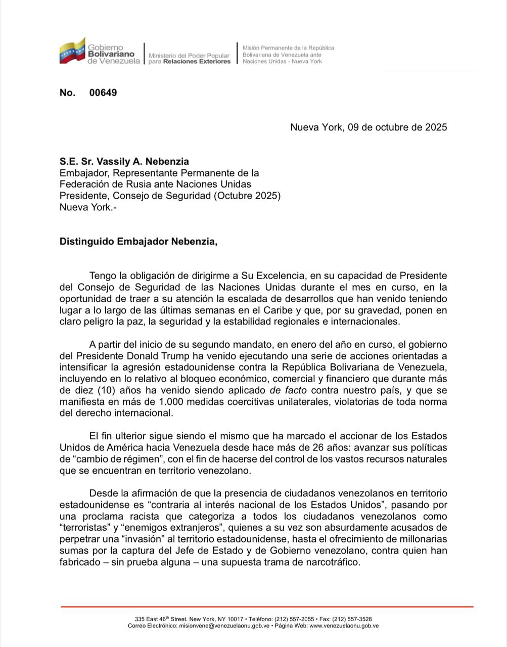 El Gobierno Bolivariano de Venezuela ha solicitado formalmente una reunión de urgencia del Consejo de Seguridad de las Naciones Unidas, ante la grave escalada de agresiones y despliegue militar sin precedentes de los Estados Unidos en el Caribe.